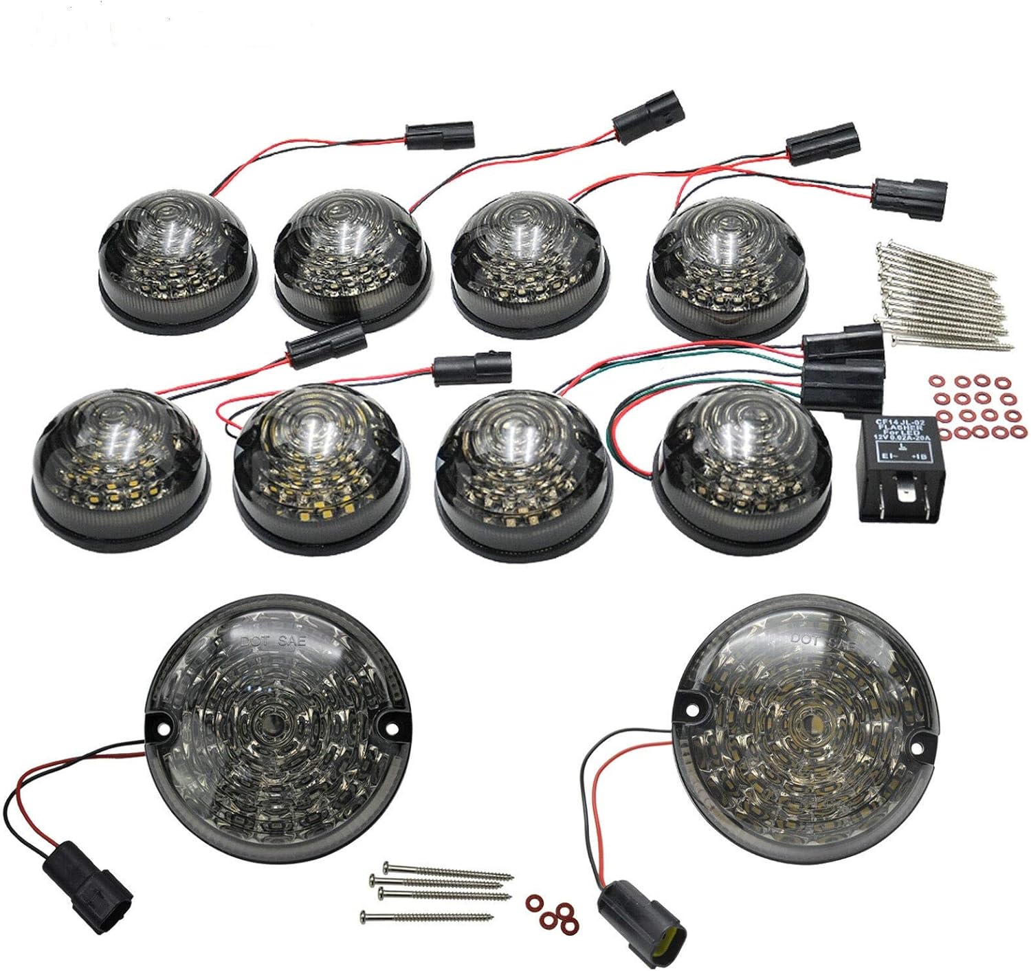 Package Includes: 1x Adjustable LED Flasher unit 4x Standard size Amber front and Rear indicator lights (73mm) 2x Standard size Red Rear stop/tail lights (73mm) 2x Standard size White front position lights (73mm) 1x Larger size reverse light (95mm) 1x Larger size rear fog light (95mm) 20X Screws + 20X Screws gasket
