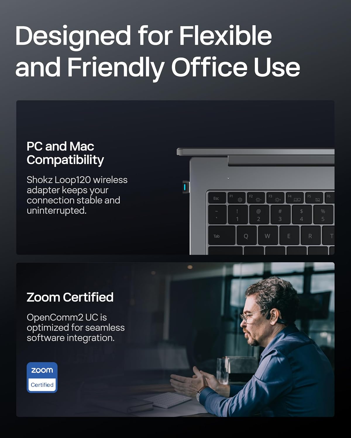 Designed for Computer Compatibility – The Shokz Loop120 wireless adapter keeps your PC or Mac connection stable and uninterrupted, and this headset is Zoom-Certified for effortless software integration