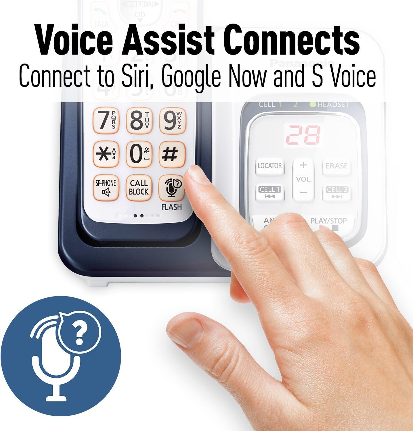 The Panasonic KX-TGD563A expandable DECT 6.0 Link2Cell Bluetooth Enabled Phone with answering system and 3 cordless handsets, allows you to link up to two cell or smart phones and integrate them into the phone system via Bluetooth, no landline required. Access the convenience of Siri, Google Now and S Voice from your handsets with one-touch Voice Assist. All of your contacts stored into your cell or smart phone can be shared with this phone system allowing you access to their phone numbers right from the handset. Hear who’s calling from across the room without having to get up with text-to-speech announcements in English and Spanish from the base unit and cordless handsets in the home/home office. Easy call block, speakerphone, and advanced TAD (telephone answering device) functions tie it all together making this system one of the most reliable and functional systems available in the market today.