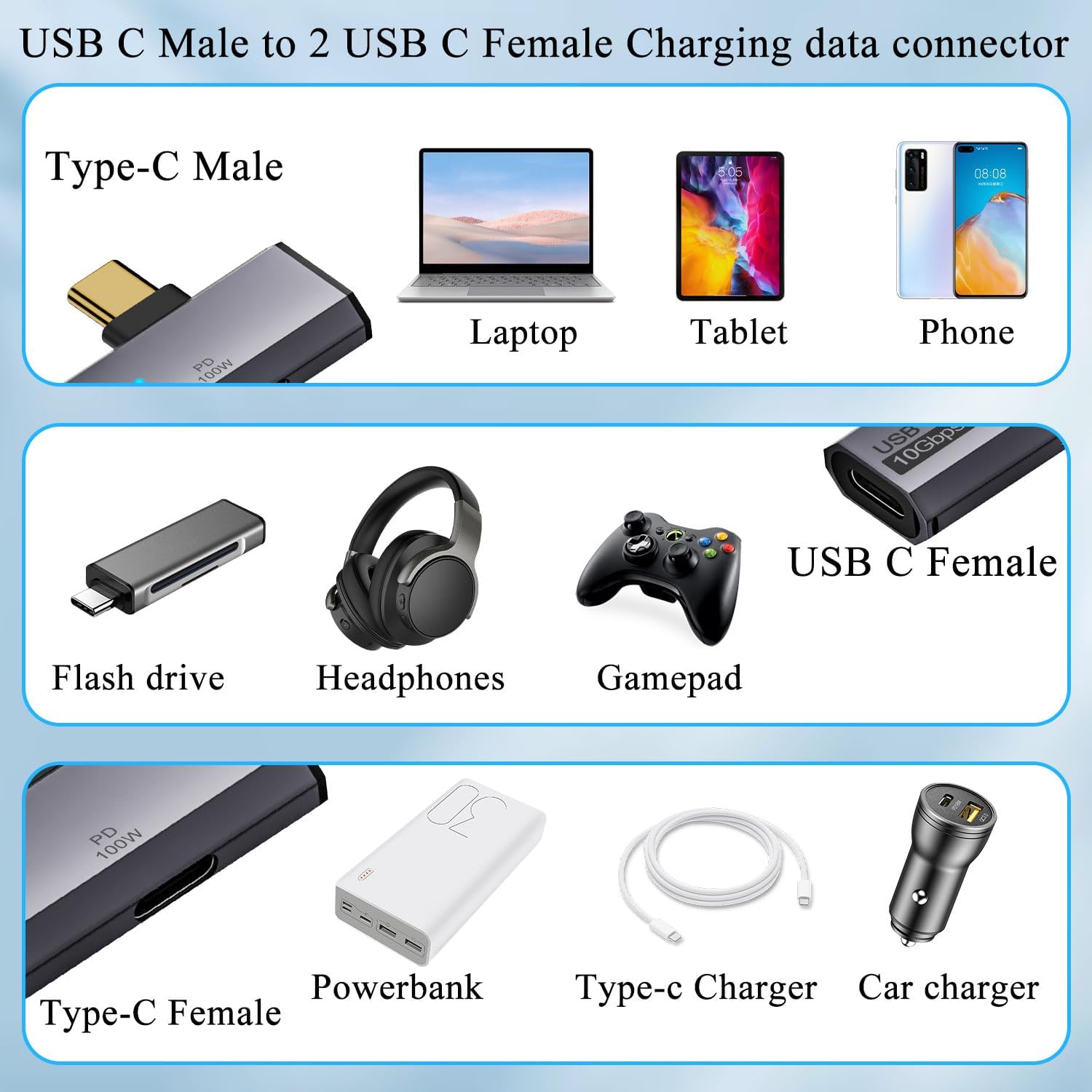 【Headphone Charging 2 in 1】PD100W USB C Headphone Charging 2 in 1 Right angle adapter. USB C 1 male to 2 female ports, can connect USB C headset while PD100W charging. Let you game entertainment without worrying about the power running out.