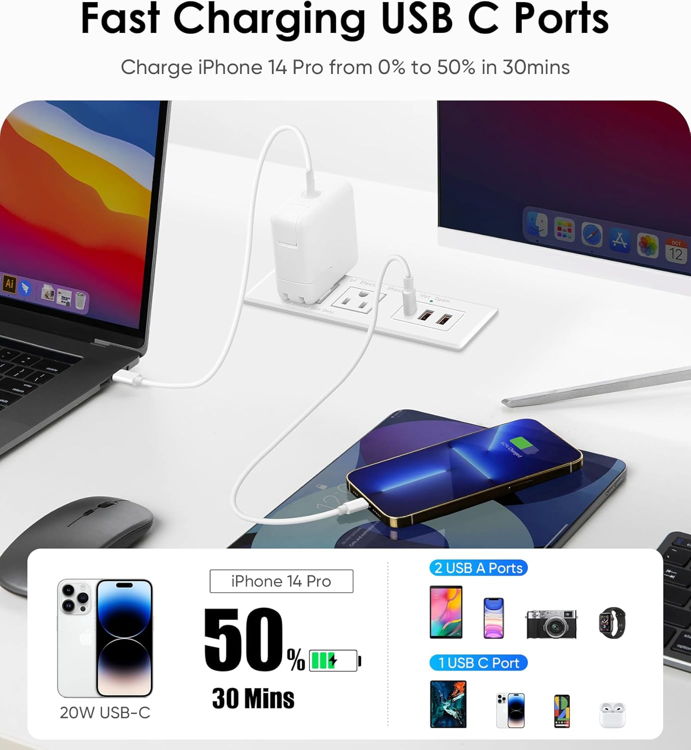 ✔ 20W USB-C Fast Charger Drawer Outlet: AC Output-125V/12A/1500W; PD 20W USB-C Port Offer 5V/3A, 9V/2.22A,12V/1.66A; QC3.0 20W USB-A Ports offer 5V/3A, 9V/2A, 12V/1.5A.(When used alone)