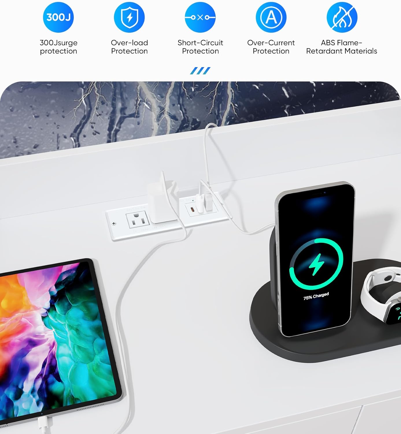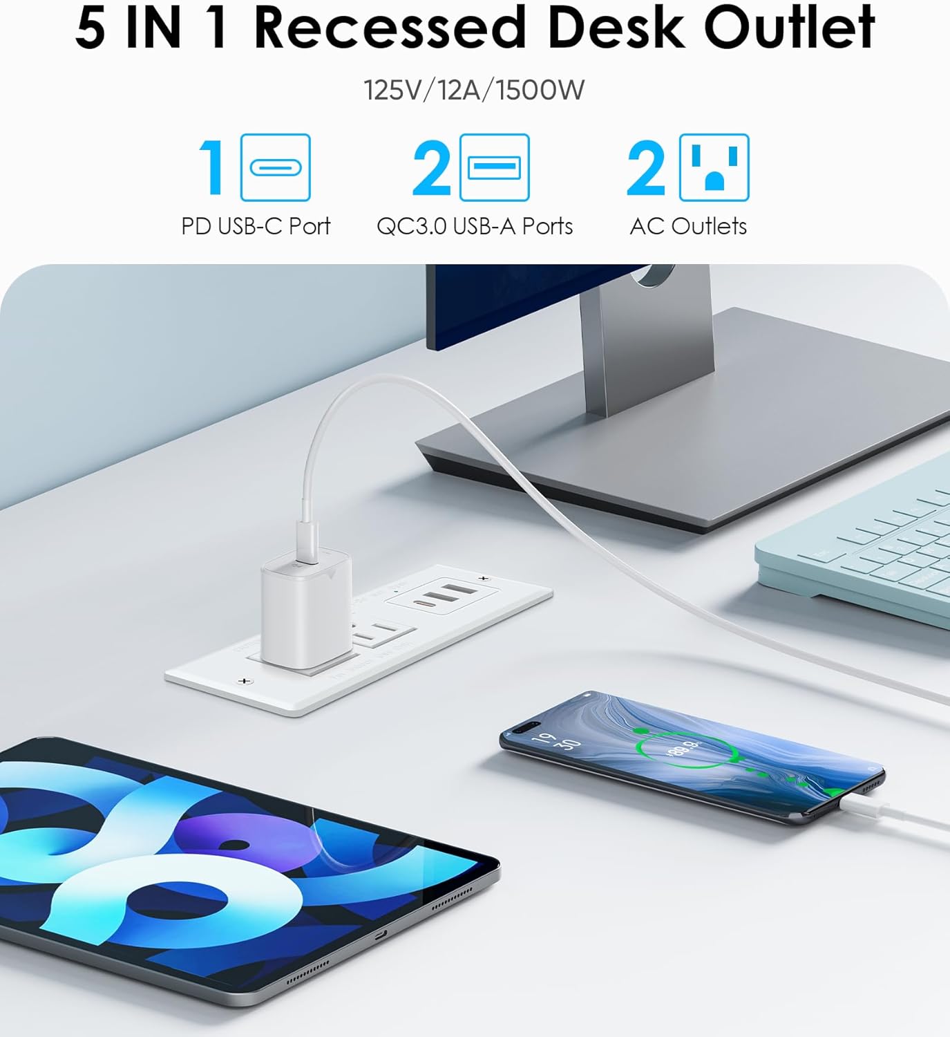 ✔ Recessed Hidden Power Strip: 2 fast charging QC 3.0 20W Max USB-A port and 1 PD 3.0 20W Max USB-C ports. Come with 2 AC Outlets. Great addition to nightstand or furniture table.