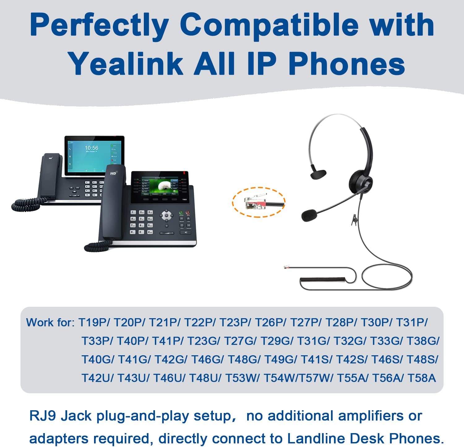Yealink IP PHONES COMPATIBILITY: This RJ9 phone headset for Yealink office phones SIP-T19P, T20P, T21P, T22P, T23P, T26P, T27P, T28P, T30P, T31P, T33P, T40P, T41P, T23G, T27G, T29G, T31G, T32G, T33G, T38G, T40G, T41G, T42G, T46G, T48G, T49G, T41S, T42S, T46S, T48S, T42U, T43U, T46U, T48U, T53W, T54W, T57W, T55A, T56A, T58A etc.