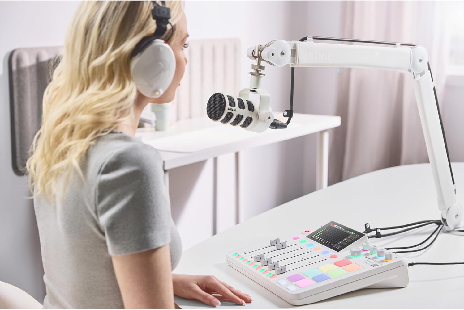 • Rode PodMic Cardioid Dynamic Broadcast Microphone (White) with Mini Tripod Desktop Mic Stand, Monitoring Headphones and XLR Cable