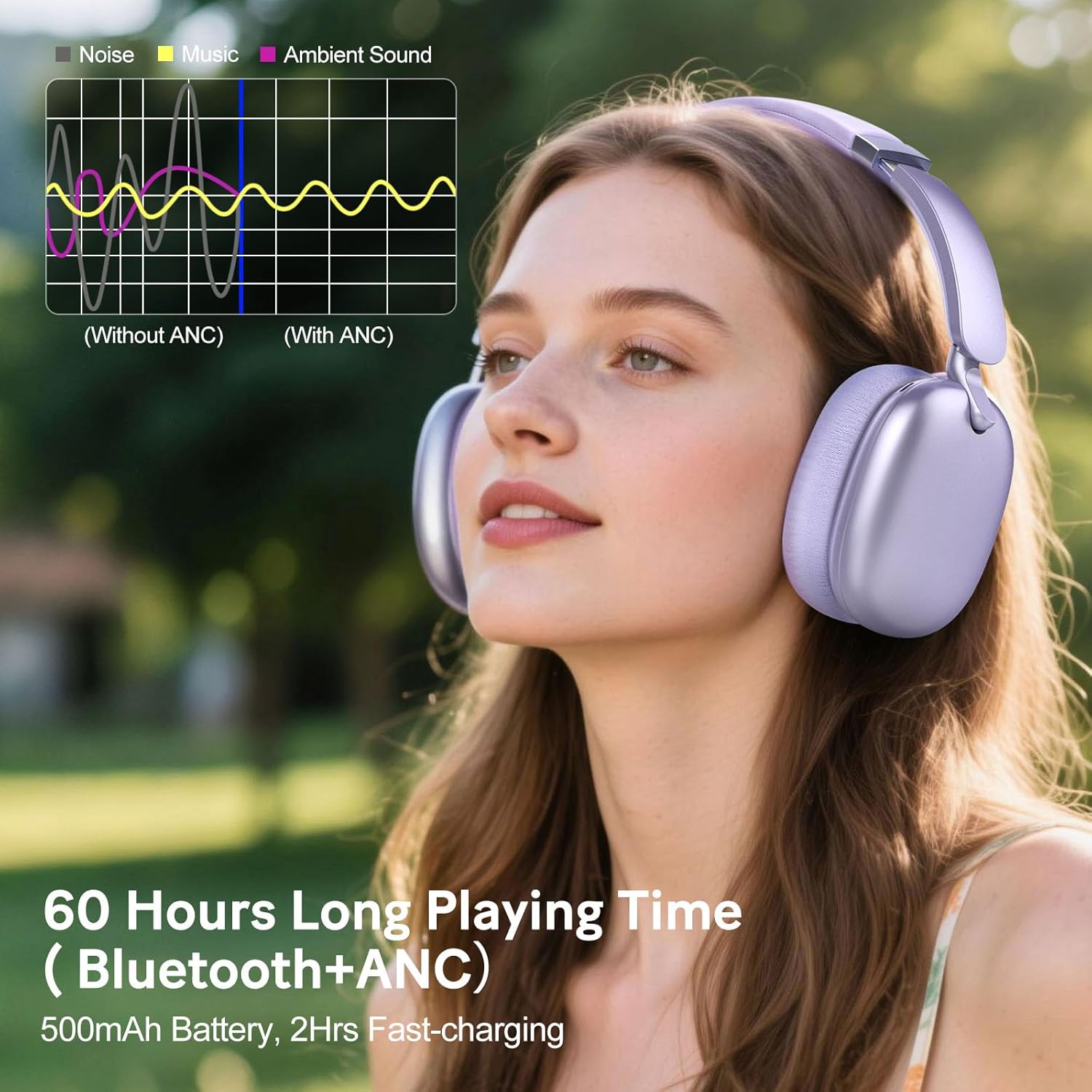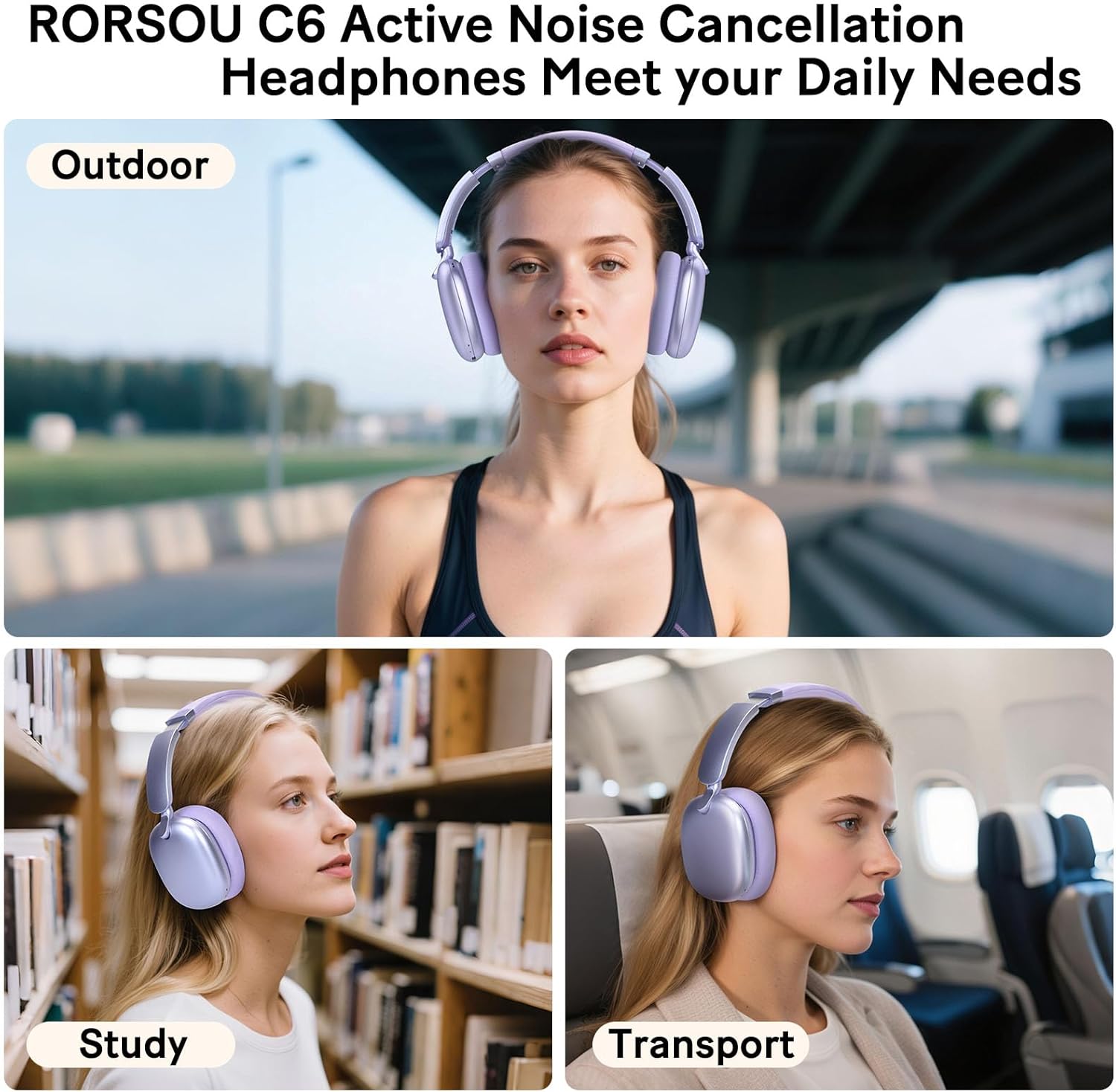 • RORSOU C6 Active Noise Cancelling Headphones, Wireless Over Ear Bluetooth Headphones, 60H Playtime, Lightweight Folding Deep Bass Comfort Fit Ear Cups Headset with Mic for iPad/Travel/PC/Home Purple