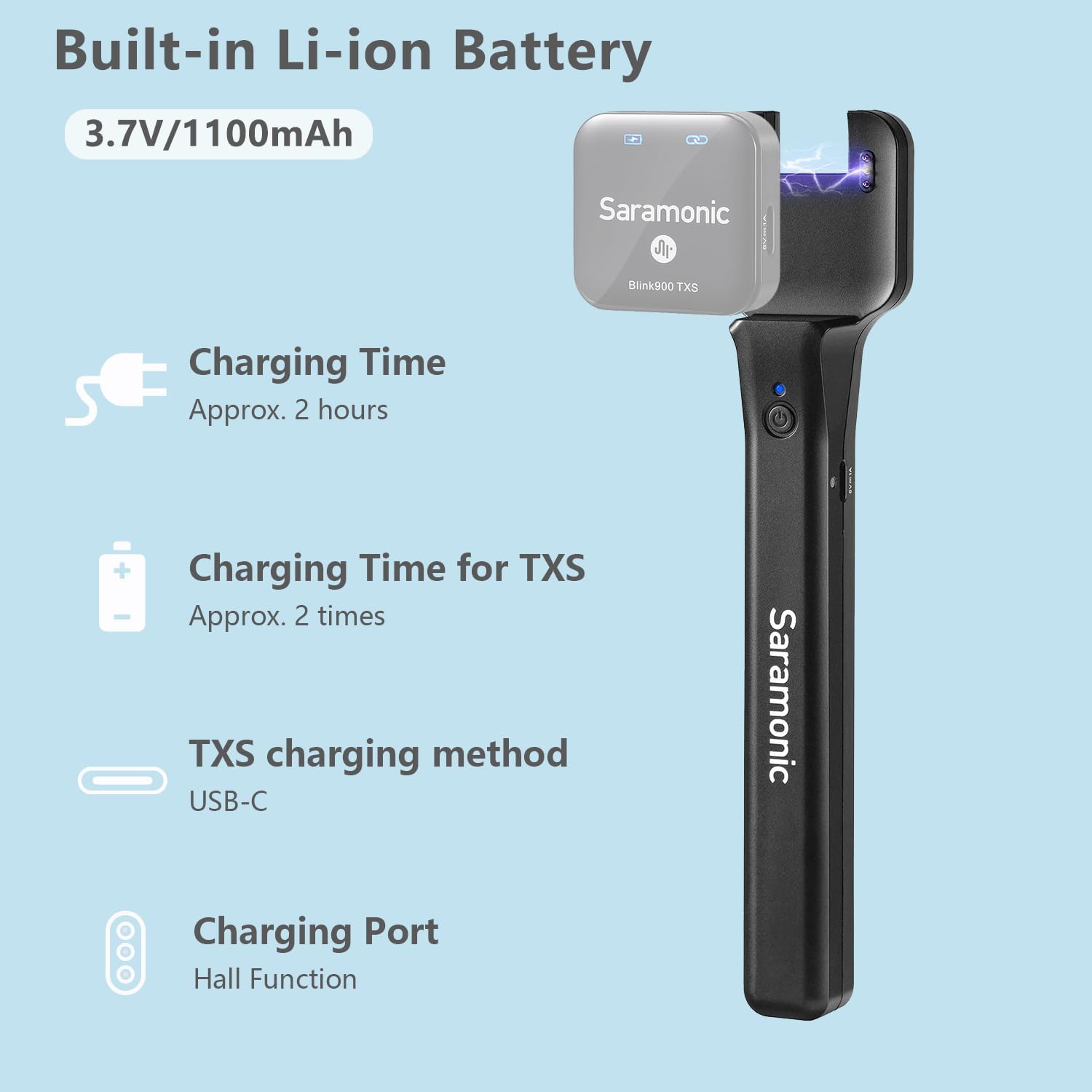 BRAND SARAMONIC SKU Blink900 HMS COLOR BLACK MATERIAL ABS & METAL POWER CAPACITY BUILT-IN LI-ION BATTERY 3.7V/ 1100 MAH CHARGING PORT USB-C CHARGING TIME APPRO. 2H CHARGING TIME(s) FOR TX APPRO. 2 TIMES COMPATIBLE TRANSMITTER MICROPHONE OF BLINK900 S1/S2/S3/S4/S5/S6/S20 DIMENSIONS 7.7*1.71*0.87 INCH WEIGHT 2.33 OZ