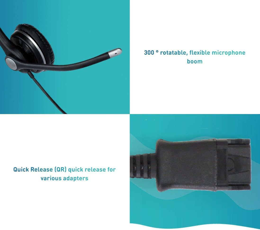 Superior wideband sound thanks to optimized speaker tuning. headphones for better insulation from the surrounding environment. Cable on one earphone only. 300-degree flexible boom. Passive noise cancelling microphone. Quick Release (QR) adapters for different connectors.