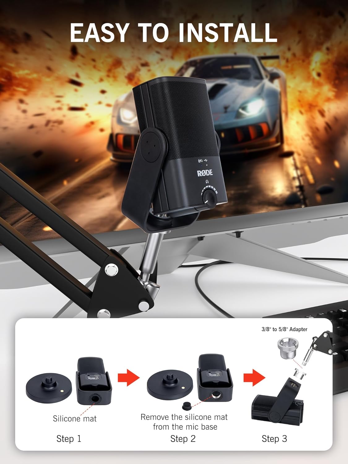 【Perfect Effect】- Suspension boom arm hold your RODE NTUSB Mini, NT-USB, NT-USB+, Rode XCM-50 USB and other Streaming microphone in any position you want. No sag, just rock solid.