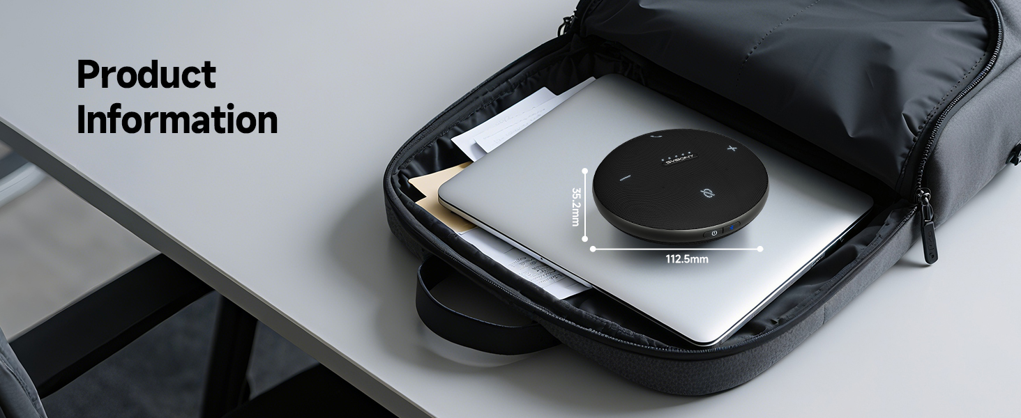 Portable & compact: pocket-sized; 112.5 × 35.2 mm (4.4 × 1.4 in); the 360 degree conference microphone weighs just 231 g (8.15 oz); Comes with a soft pouch for effortless travel—your perfect companion for business trips and remote work