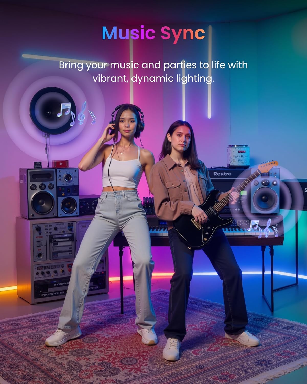 RGBICWW Lighting Effects: Powered by RGB + IC independent chips, SwitchBot Strip Light can display multiple colors on a single strip simultaneously. Enjoy 8 dynamic effects, including smooth gradients and flowing patterns, plus over 16 million colors and 26 preset scenes. The built-in high-sensitivity microphone syncs light to music and gameplay for immersive TV backlight, gaming setups, bedroom ambience or party lighting.