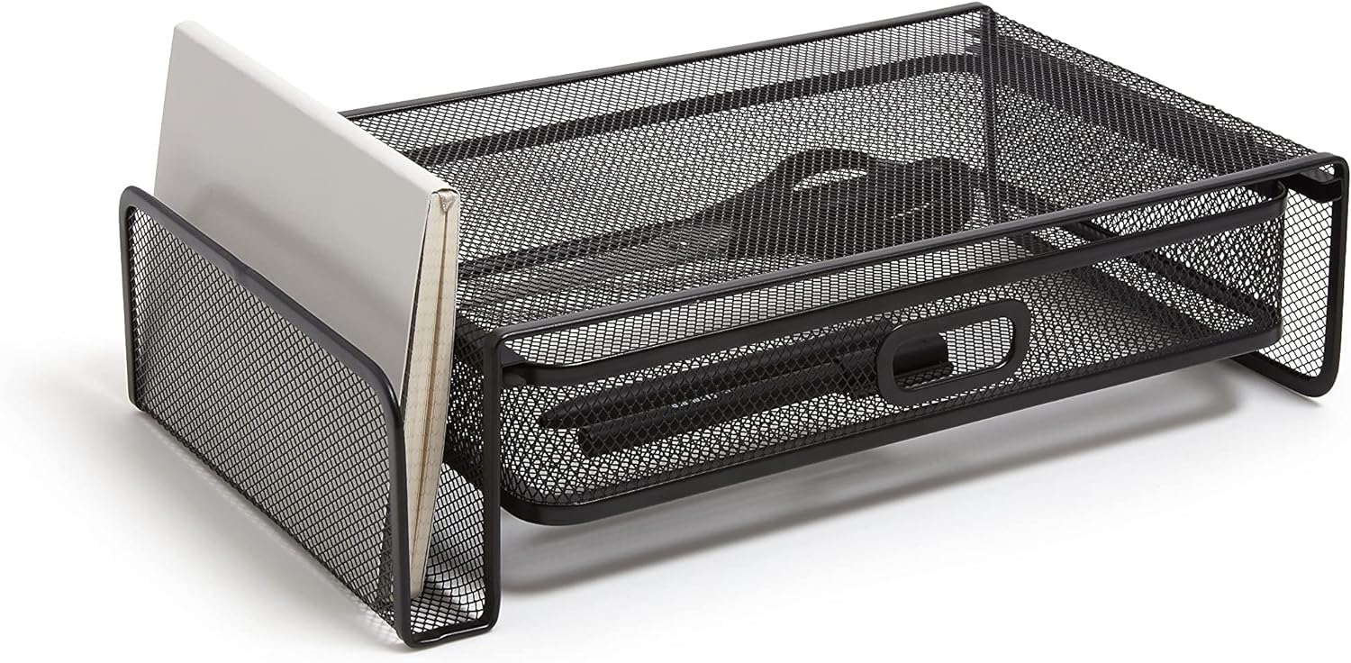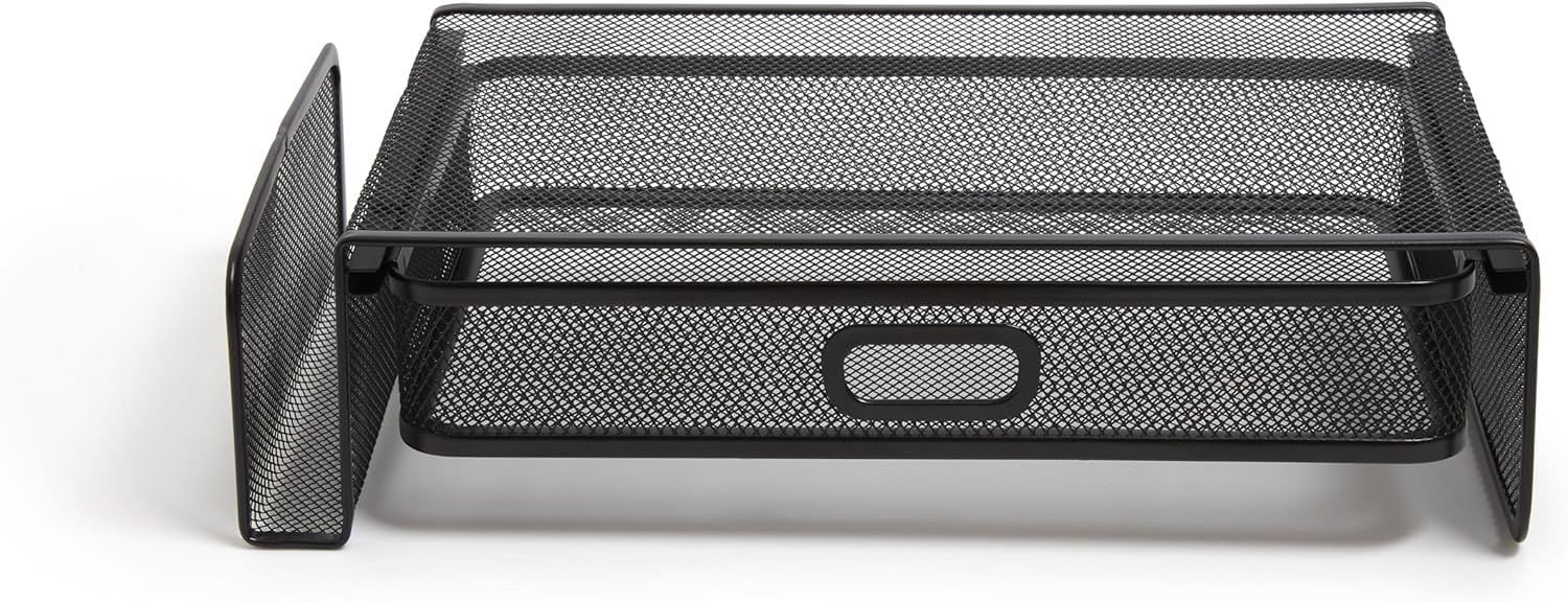 Free up your workspace. Durable mesh construction offers long-lasting use. Single drawer sits beneath the stand to hold pens, sticky notes, push-pins and staples. Side slot keeps notepads, folders and reports within reach. Feet keep marks off delicate surfaces and features flat rounded-square corners for a sleek look.