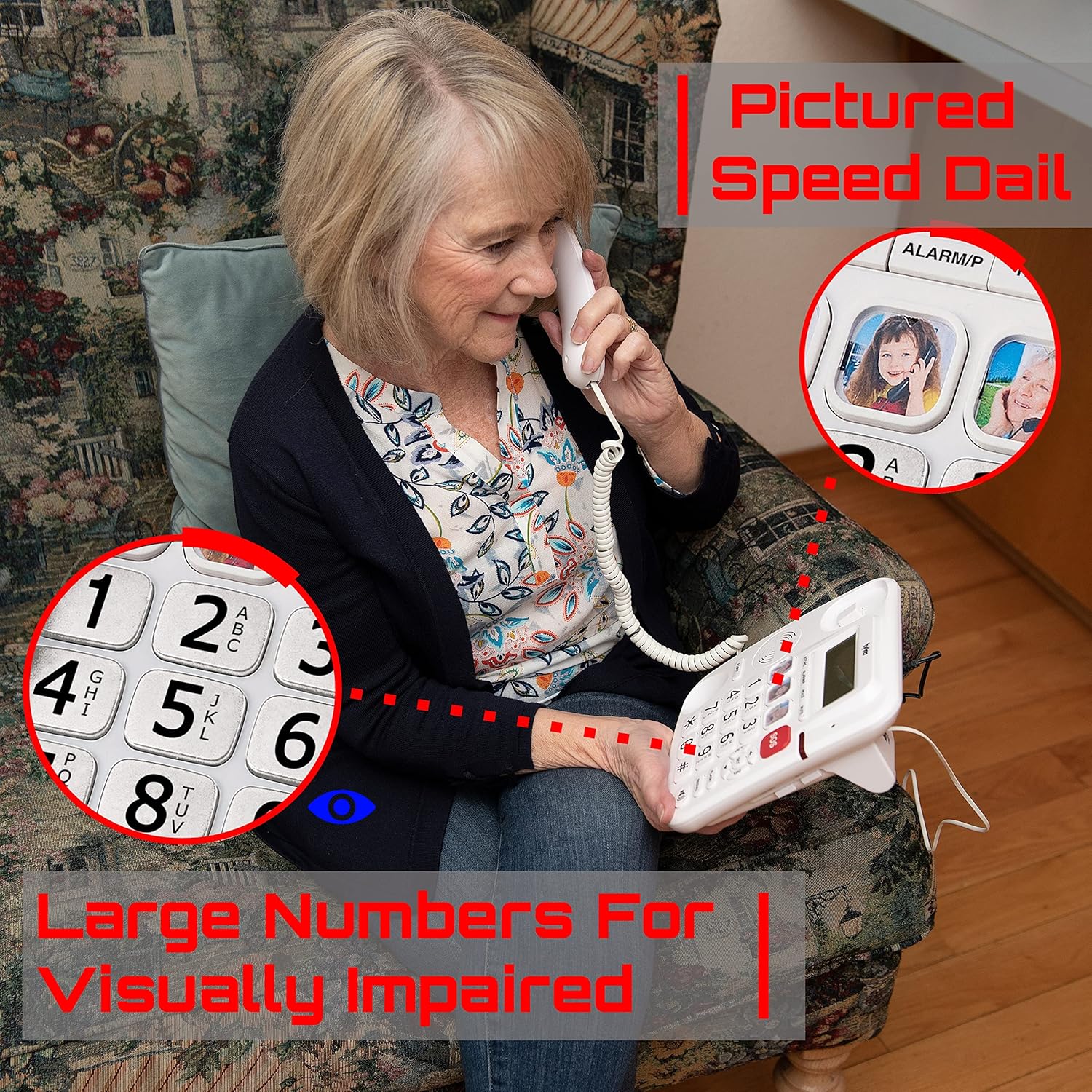 FUNCTIONALTIY: Fully equipped with SOS Emergency button, day/month calander, time, alarm, LED call indicator, flash, mute, redial functions. Designed with clear large buttons for visually impared and for ease of use. Simple call volume switch on hanset and ringer volume under the base. AC-in adapter included.
