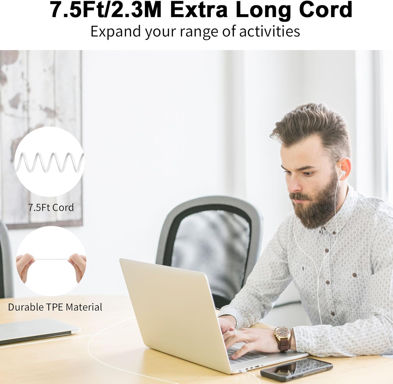 • USB Headset with Microphone for PC Laptop,7.5Ft USB A Headphones Earbuds for Computer with in-Line Control Noise Cancelling Lightweight Wired Computer Headphones for Dell/HP Zoom School Class,White