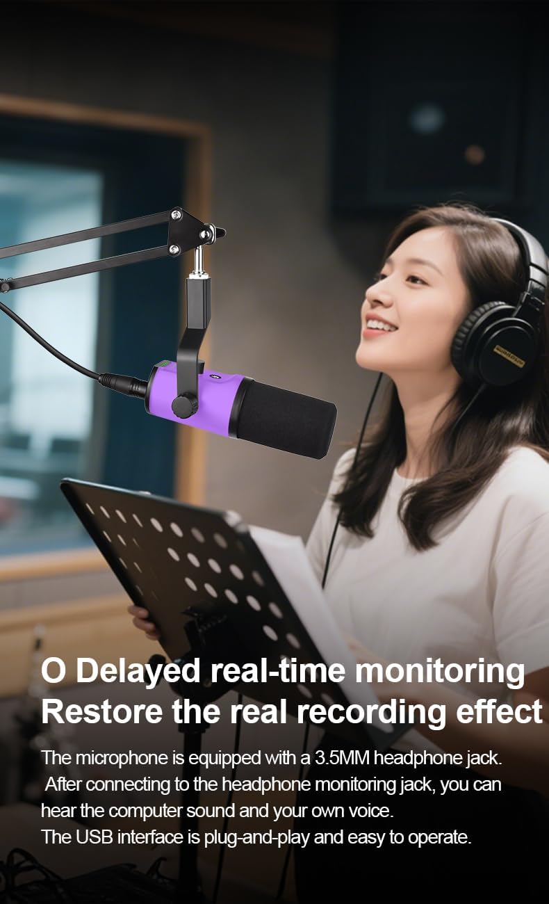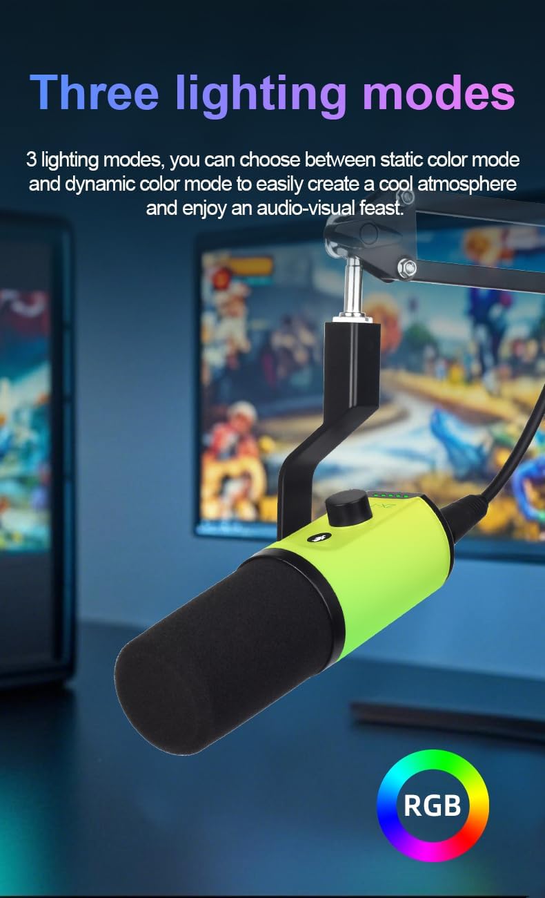 Elevate your content creation with this professional-grade desktop microphone featuring stunning RGB lighting effects. This versatile microphone offers dual-mode connectivity through both USB and XLR interfaces, making it perfect for streaming, podcasting, music recording, and broadcasting. The USB interface provides plug-and-play simplicity for computers, tablets, and mobile phones (with converter), while the XLR connection allows integration with professional audio equipment like mixers and sound cards. A convenient 3.5mm headphone jack enables real-time monitoring of both computer audio and your voice, ensuring perfect audio levels during recording. The microphone comes mounted on a sturdy desktop stand for optimal positioning, and its sleek design with customizable RGB lighting adds a professional touch to any setup. The plug-and-play USB interface makes it incredibly user-friendly, while the professional XLR output ensures lossless audio transmission for the highest quality recordings. Whether you’re a content creator, musician, or broadcaster, this microphone delivers the professional audio quality and versatility you need.