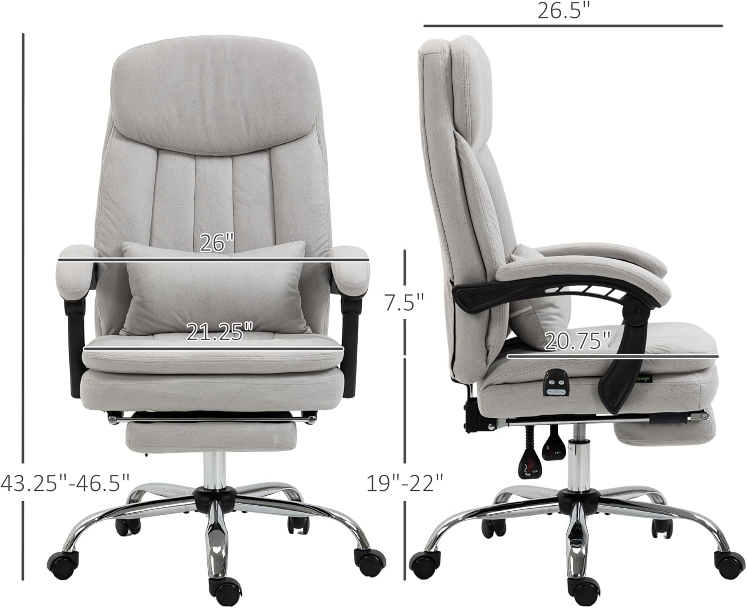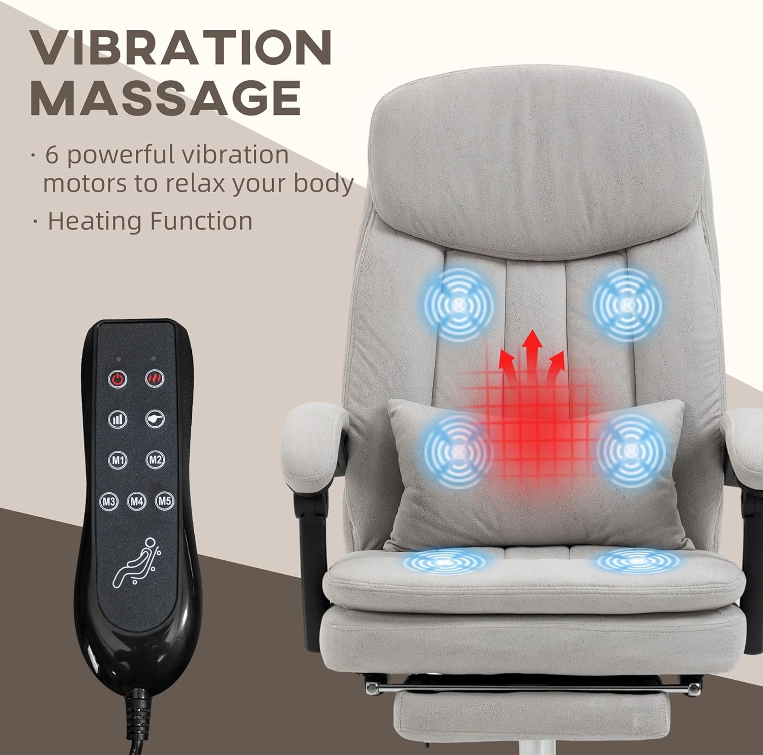 Six vibration massage points with five modes and lumbar heating to relax your body Take a break and stretch out with a 135° recline angle and footrest Adjustable seat height to fit your comfort A lumbar pillow for support Use massage with a wired remote control, and with the side pocket to store Microfibre is breathable, comfortable, easy-care, and resistant to the wear and tear of busy households Swivel wheels and seat ensure easy and quick mobility Assembly required