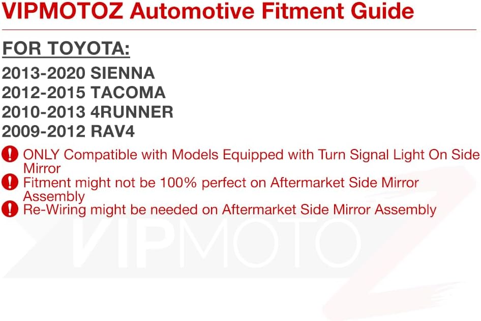 [Fitment Guide] – Compatible with 2012-2015 Toyota Tacoma / 2010-2013 4Runner N280 / 2009-2012 RAV4 XA30 / 2013-2020 Toyota Sienna XL30 Side Mirror with Turn Signal Models