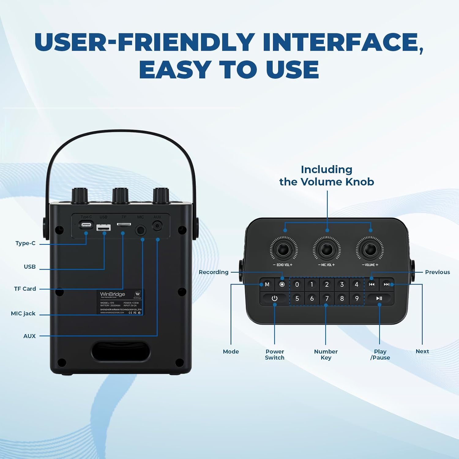Versatile Input Options — Enhance your audio experience with the mini portable speaker with microphone set. It features Bluetooth 5.3 for seamless pairing with smartphones and other devices. Play audio from USB, TF cards, or AUX inputs. The bluetooth voice amplifier also includes a 6.35mm jack, supporting additional wired or wireless microphones with an adapter for simultaneous use.