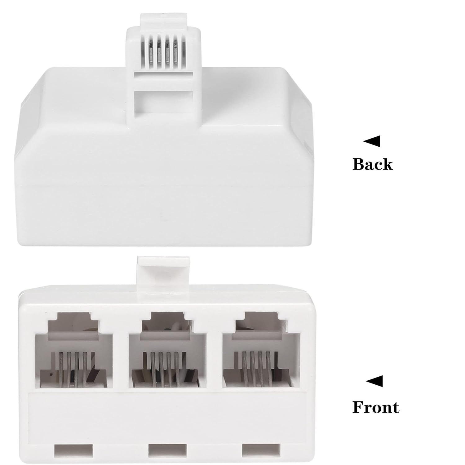 Package Includes:3 pack white telephone jack splitter(One end is 6P4C male plug and the other end is two 6P4C RJ11 sockets).