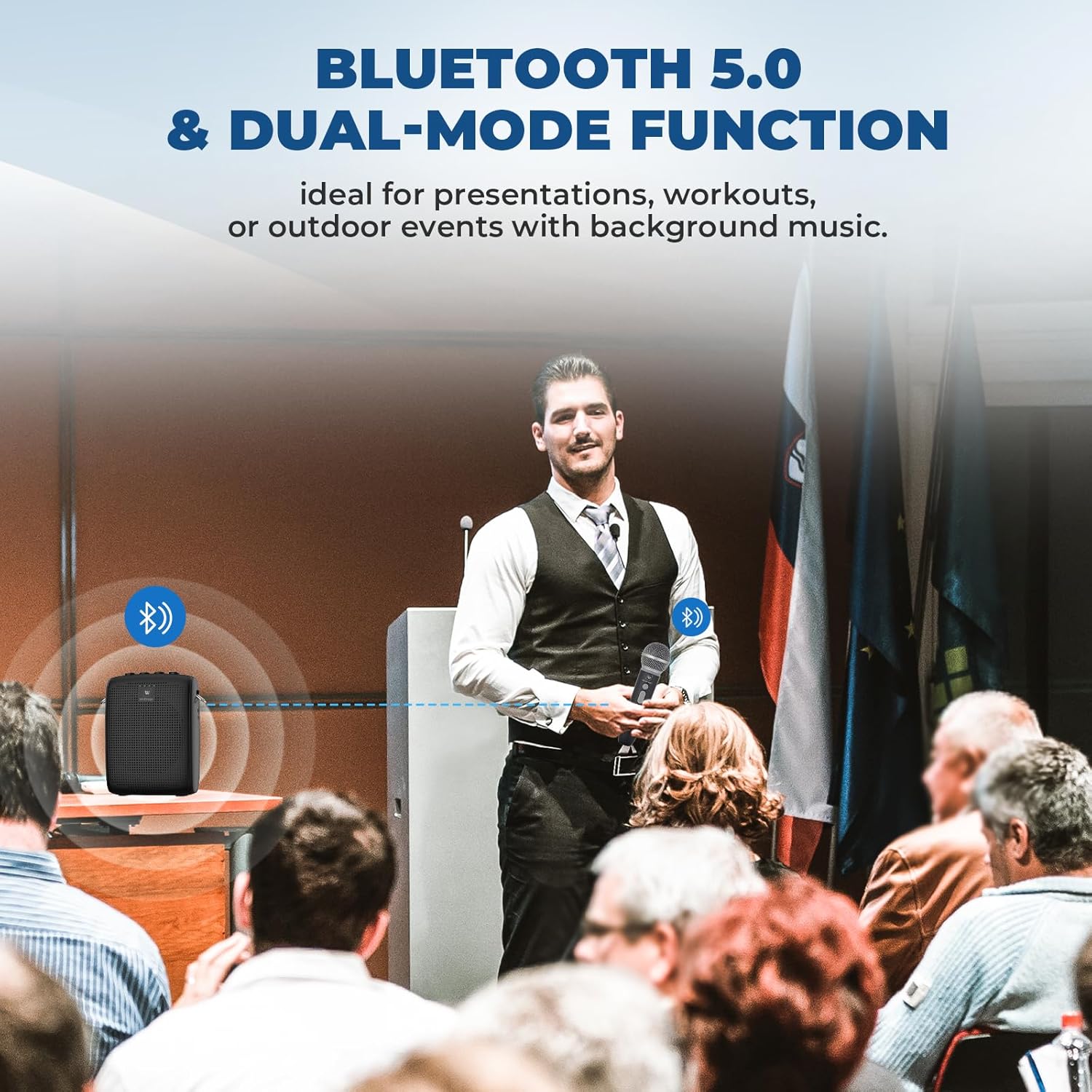 Dual-Mode Bluetooth 5.0 Amplifier: Use as a Voice enhancer for singing and speeches. and a Wireless loudspeaker for background musicPerfect for retail promotions, tour guides, or wedding hosting with crystal-clear audio.