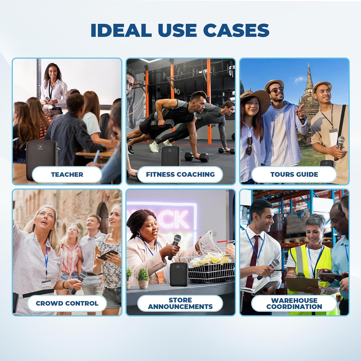 Designed for professionals, this versatile voice amplifier delivers powerful, crystal-clear sound for teachers, fitness coaches, tour guides, retail staff, Perfect for classrooms, gyms, outdoor tours, stores, and public events, it ensures reliable, high-quality audio projection in any environment
