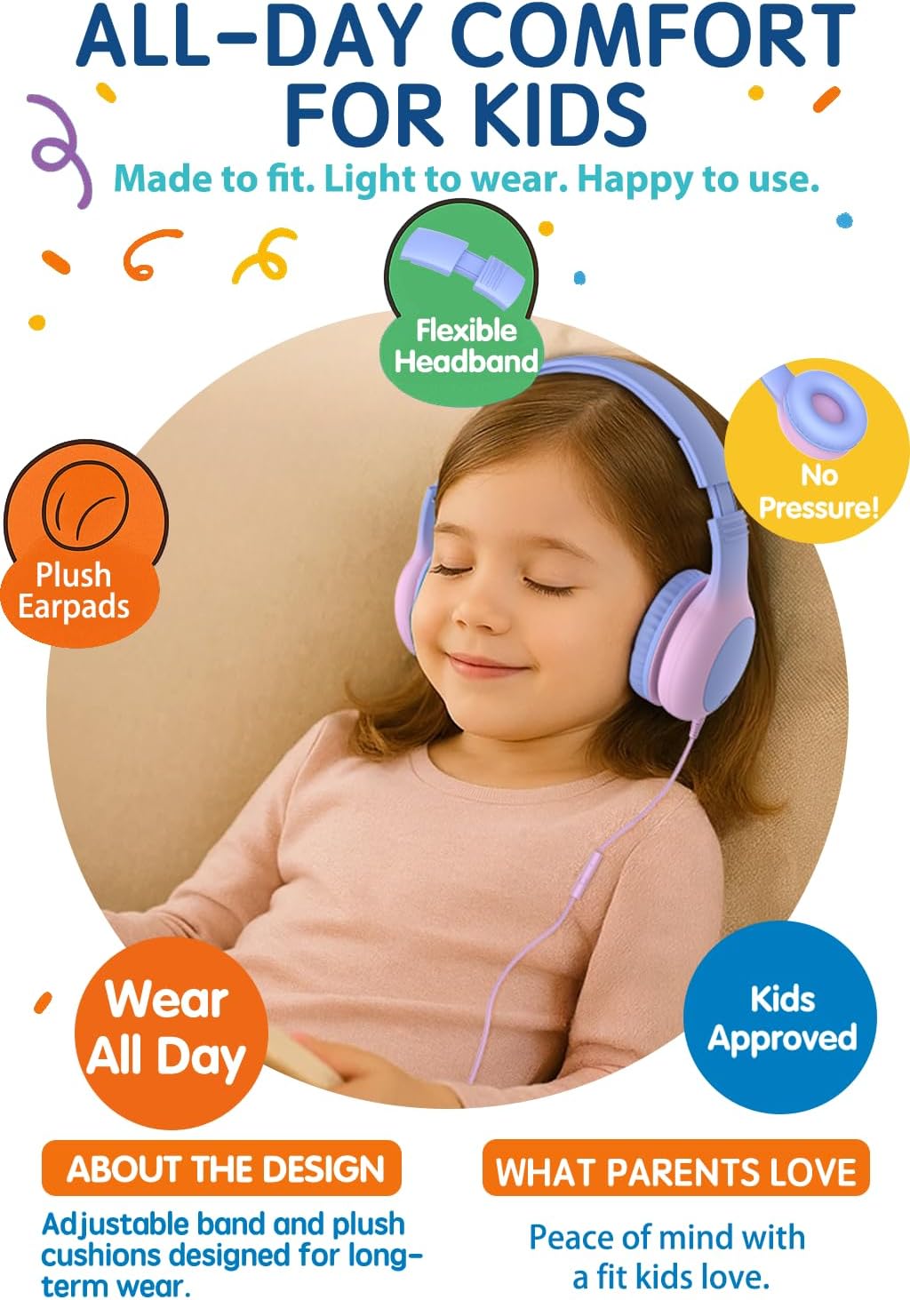 Tangle-Free Cord for Easy Handling: Say goodbye to messy cords! Our kids headphones with cord feature a durable, anti-tangle design, making them easy for kids to use and store without frustration—ideal for daily play or travel.