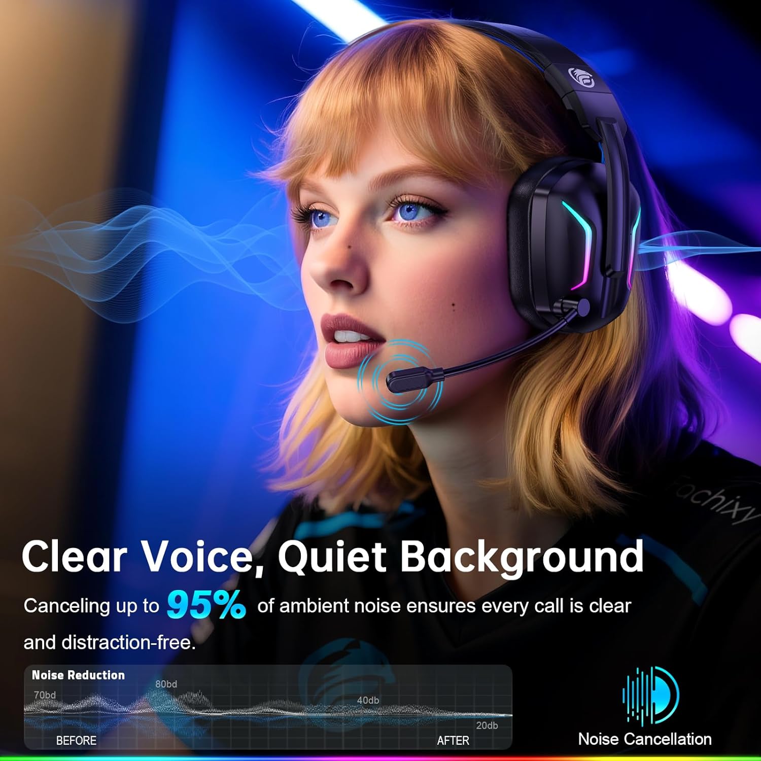 🏆【Experience gaming audio on a new level】Enhance your gameplay with our wireless gaming headset, equipped with a powerful 50mm driver for immersive 3D stereo sound. Hear every detail – from enemy footsteps and precise shots to team commands – clearly and distinctly. This gaming headset offers an immersive sound experience and gives you the decisive advantage. Perfect as a gift for boys, girls, friends, and family.
