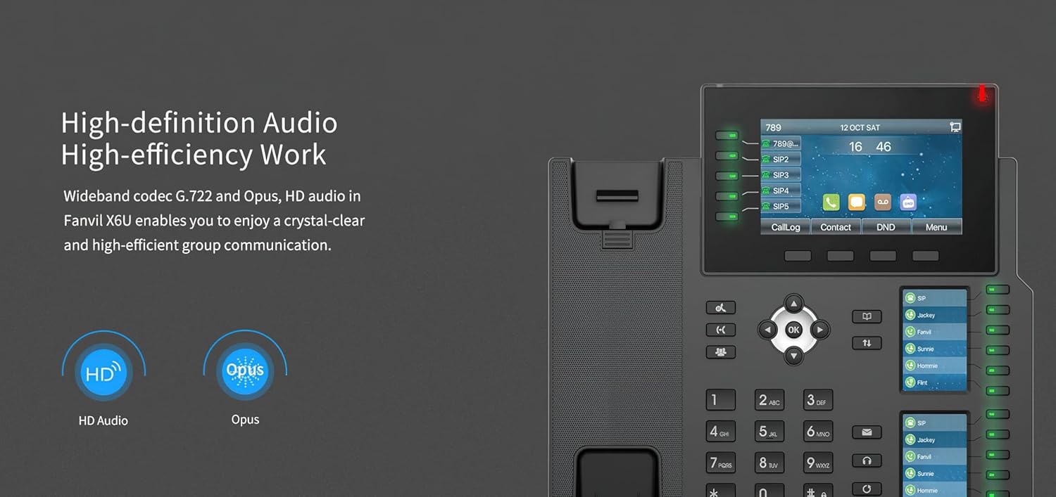 X6U-V2 Enterprise IP Phone, 20 SIP Lines, 6-Way Conference, Bluetooth, HD Audio, Dual Gbe Ports, PoE, WiFi, Support EHS Wireless Headset, Compatible with Major PlatformsX6U-V2 is an enterprise IP phone designed for busy professionals requiring advanced telephony features. With six-way conferencing, multiple SIP lines, and superior HD audio, it enhances communication efficiency. The phone’s triple-color display and Bluetooth support provide user-friendly interaction and wireless headset connectivity. Integrated PoE and optional WiFi support offer flexible deployment options in modern office environments. Power adapter not includedKey Features: