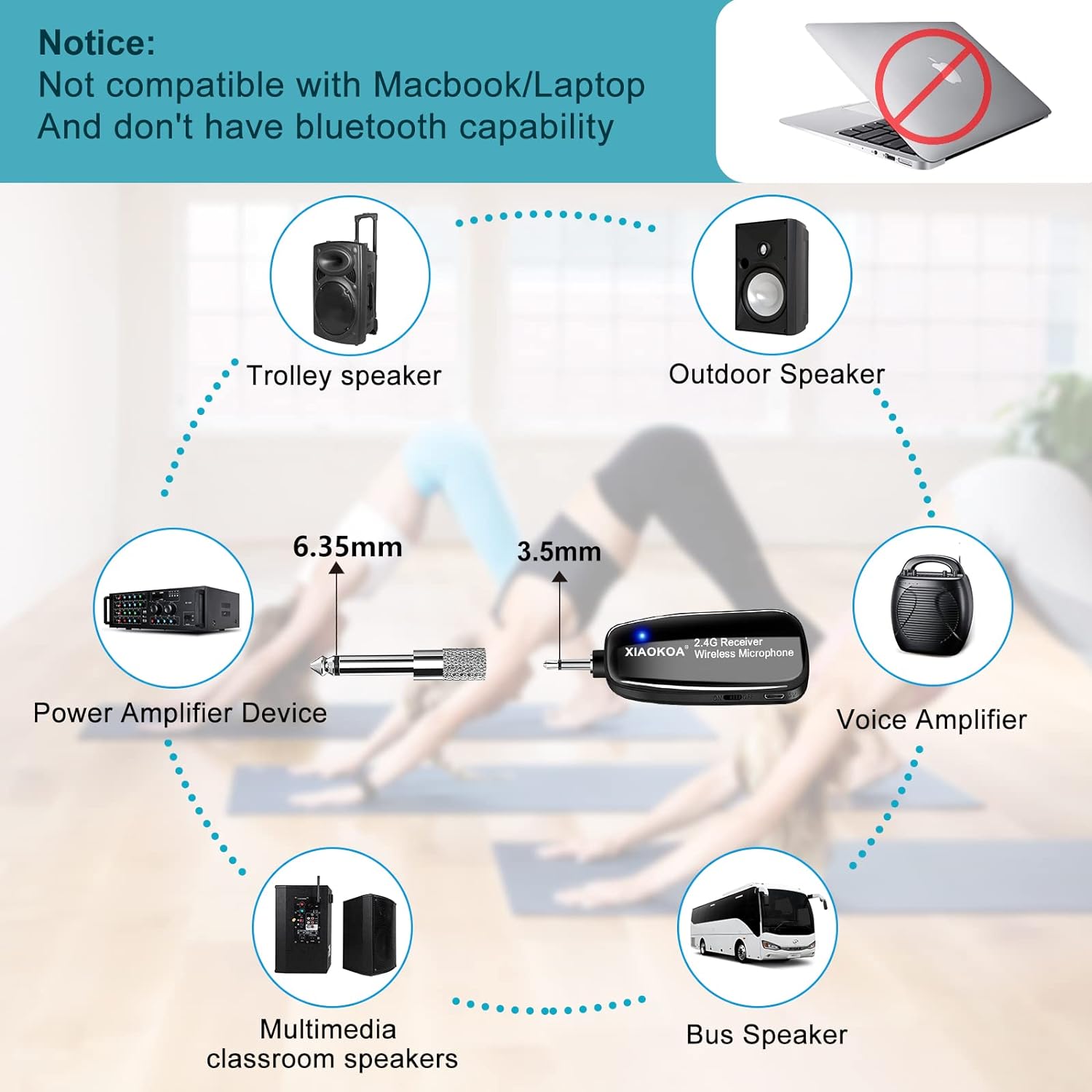 Wireless Microphone: Do not support mobile phone/ Macbook/computer,Not support Aux or digital audio system.Only suitable for PA equipment with MIC input jack.With 165ft range transmission distance.