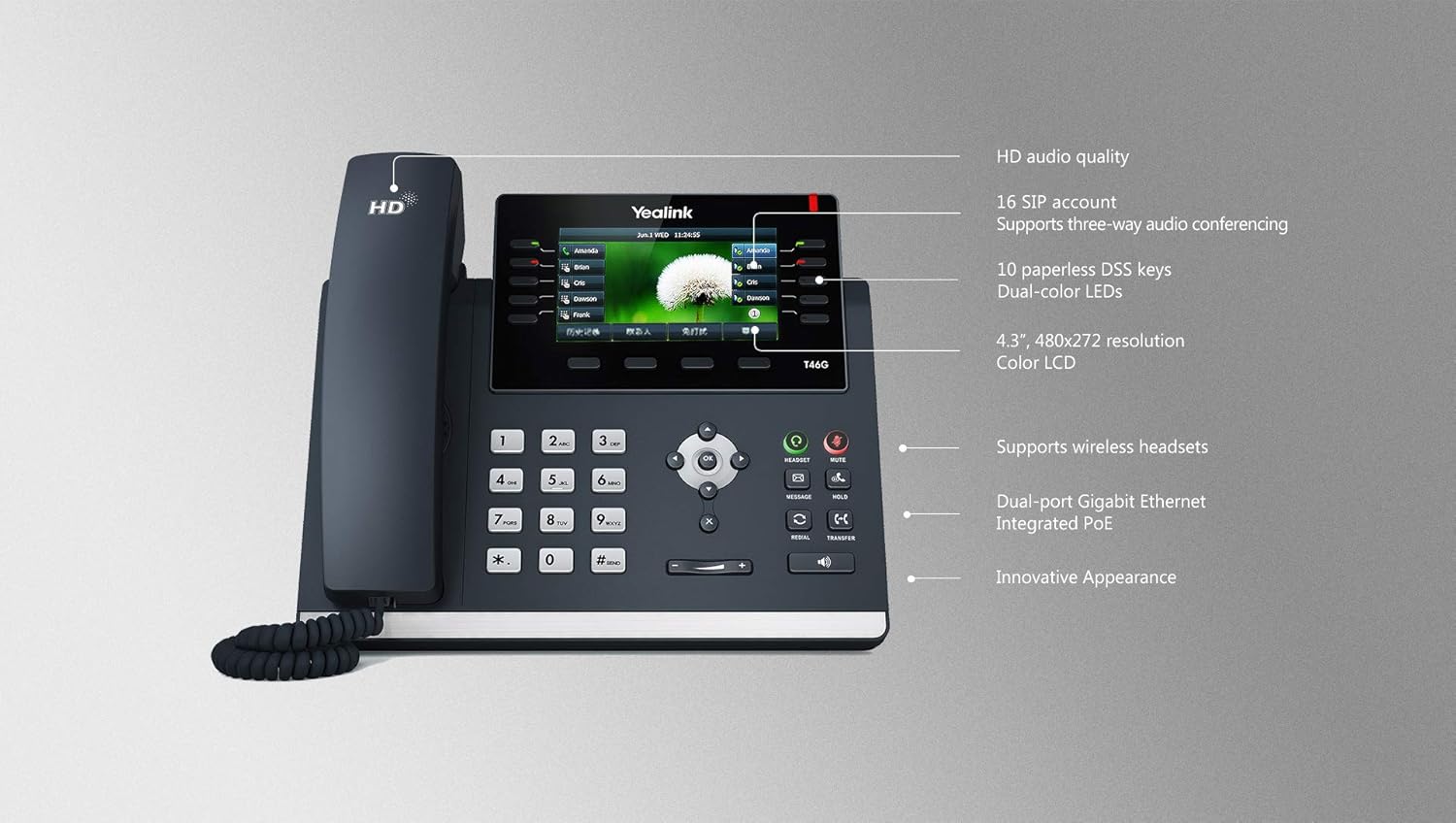 Audio: Supports Wideband Audio, HD Audio through handset, headset and speakerphone