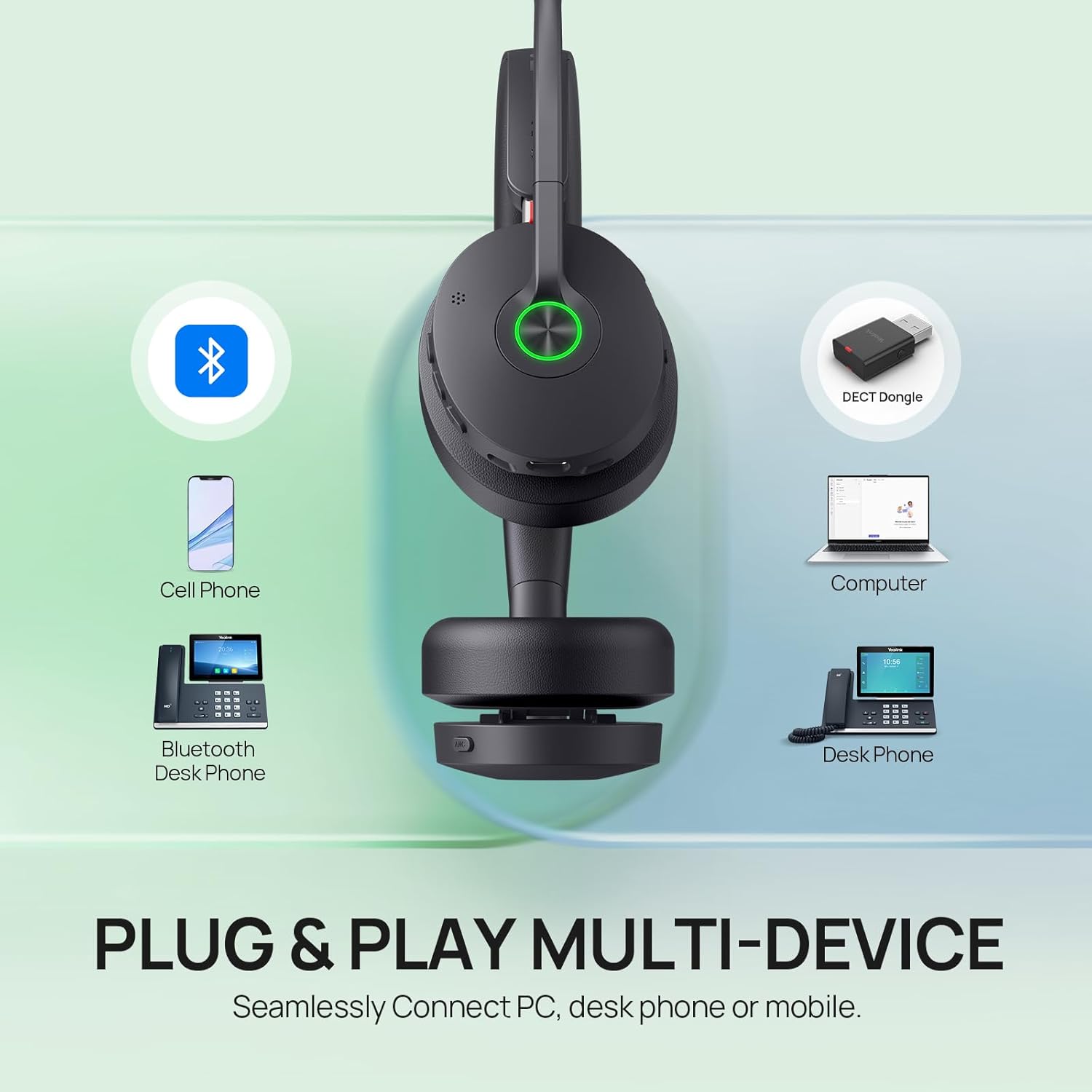 492 ft Dual-Mode Portable Headset: DECT+Bluetooth wireless headset with DECT dongle and carrying case for plug-and-play use across multi-devices(PC/phone/ mobile). Enjoy a 492 ft wireless range, partner for hybrid work, travel, or work-from-home