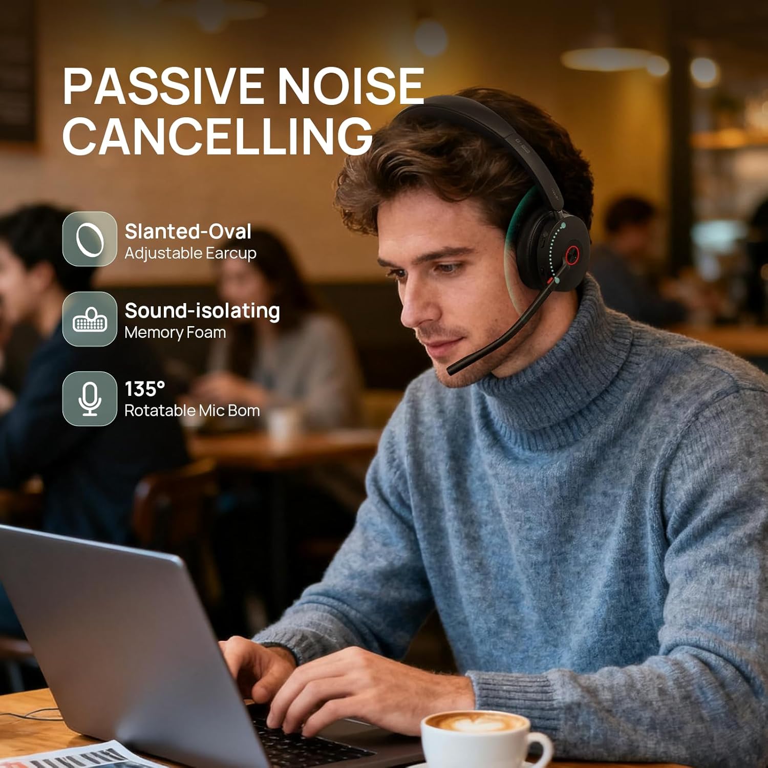 Passive Noise Cancellation (PNC): Slanted oval earcups with noise-isolating memory foam provide hybrid work headset natural fit and physical noise blocking. 135 mm mic boom ensures accurate voice pickup for crystal-clear calls