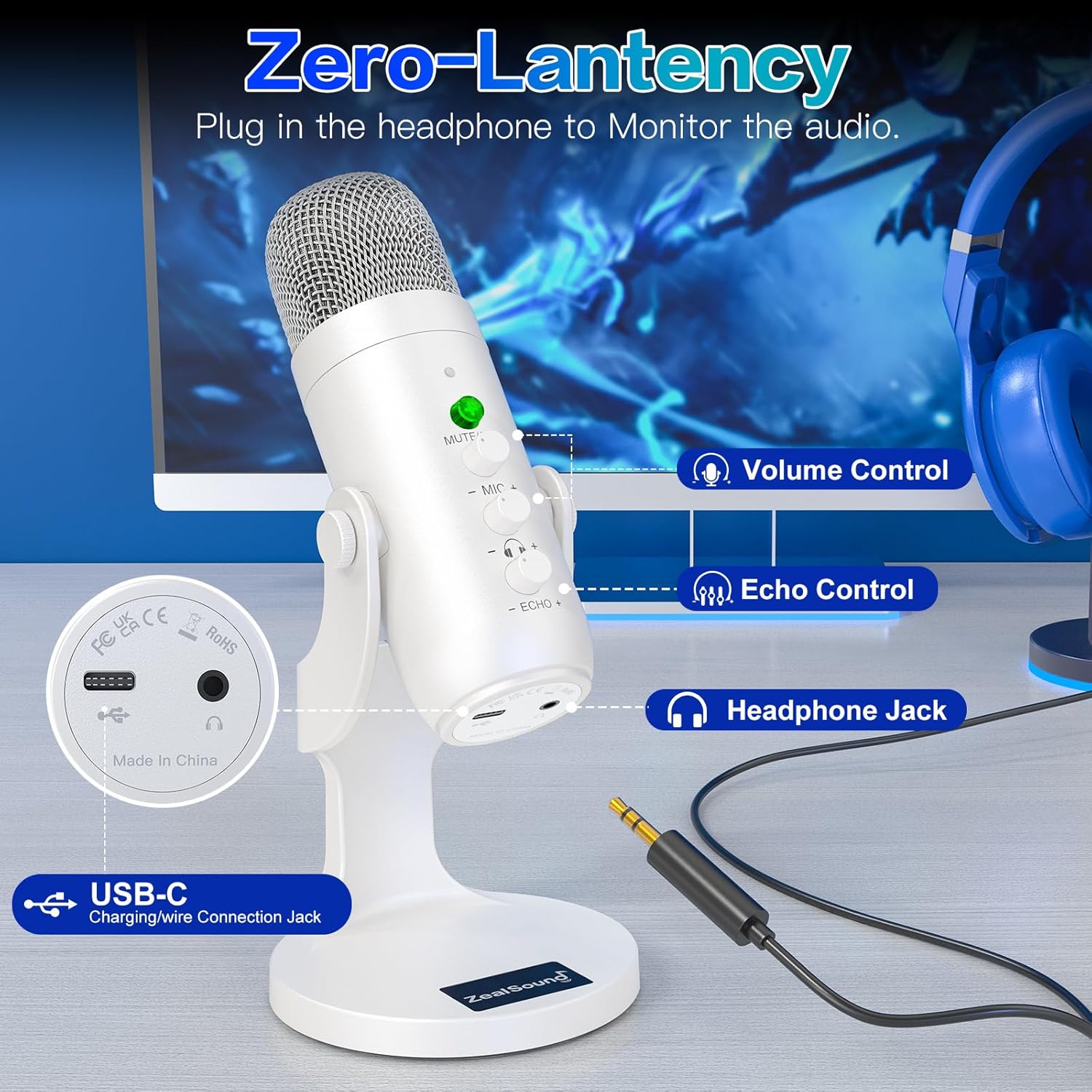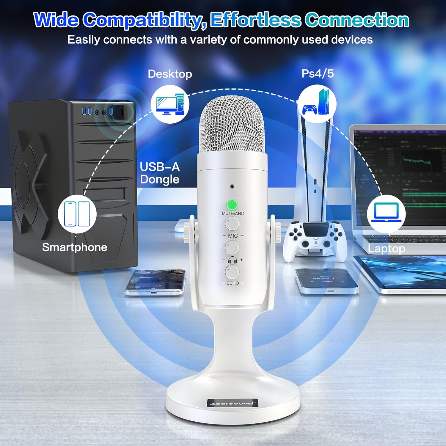 • ZealSound Wireless Microphone,USB Mic for iPhone PC iPad Android Phone-Cordless Condenser Desktop Microphones with Mute Echo Monitor Volume Gain 2.4GHz for Podcast,ASMR,Gaming,YouTube Video/K66 White